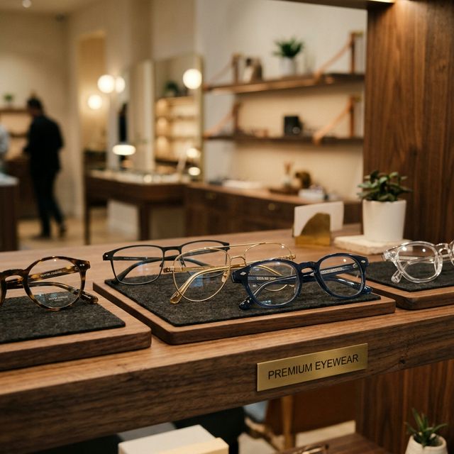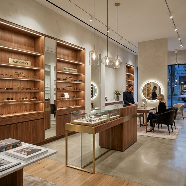 Премиальный интерьер, натуральные материалы дерева и мягкий свет. Мы создали пространство, где выбор очков становится удовольствием.